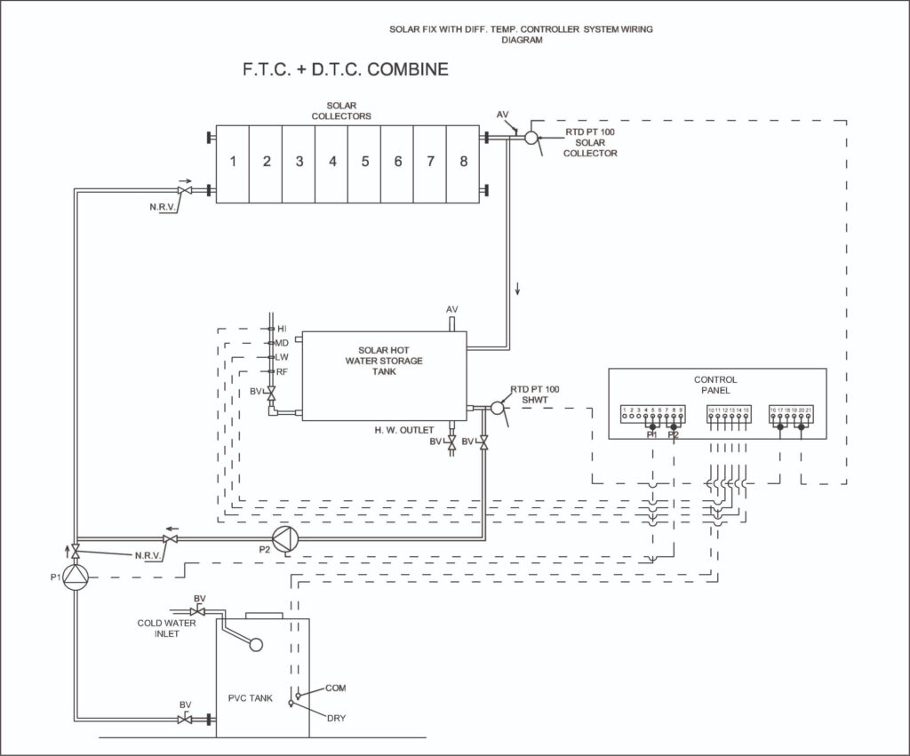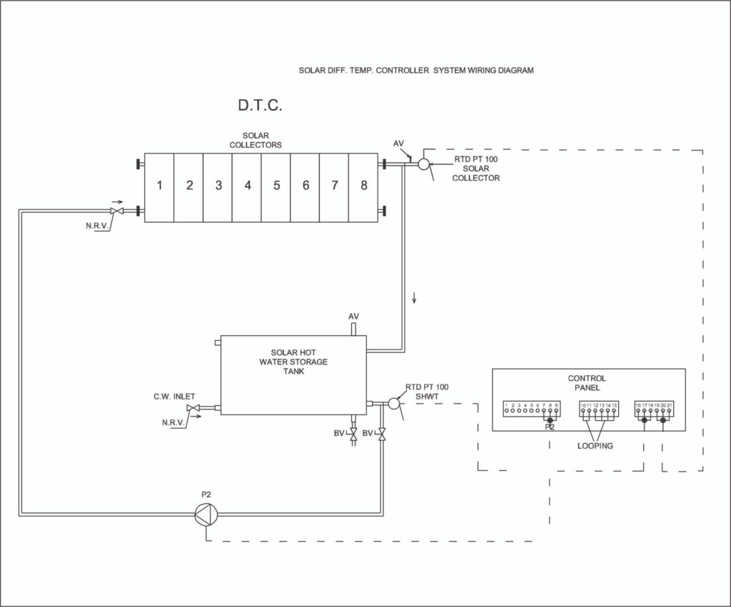 3. In differential logic, the controller compares the temperature of the storage tank and the solar collector. If temperature of the storage tank is less than the solar collector temp – differential set value, then Pump2 will turn ON. It will start circulating the water from the storage tank to the solar collector. This will continue till storage tank temperature is greater than (solar collector temp – differential set value – 2 deg C).